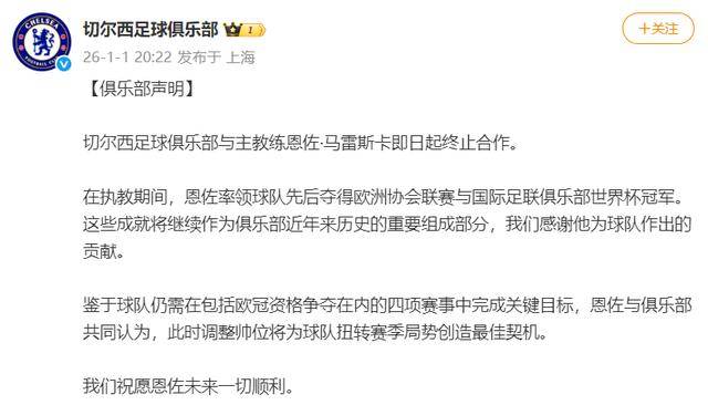 切尔西在官方公告中表示:“鉴于球队仍需在包括欧冠资格争夺在内的四项赛事中完成关键目标,恩佐与俱乐部共同认为,此时调整帅位将为球队扭转赛季局势创造最佳契机。我们祝愿恩佐未来一切顺利。”