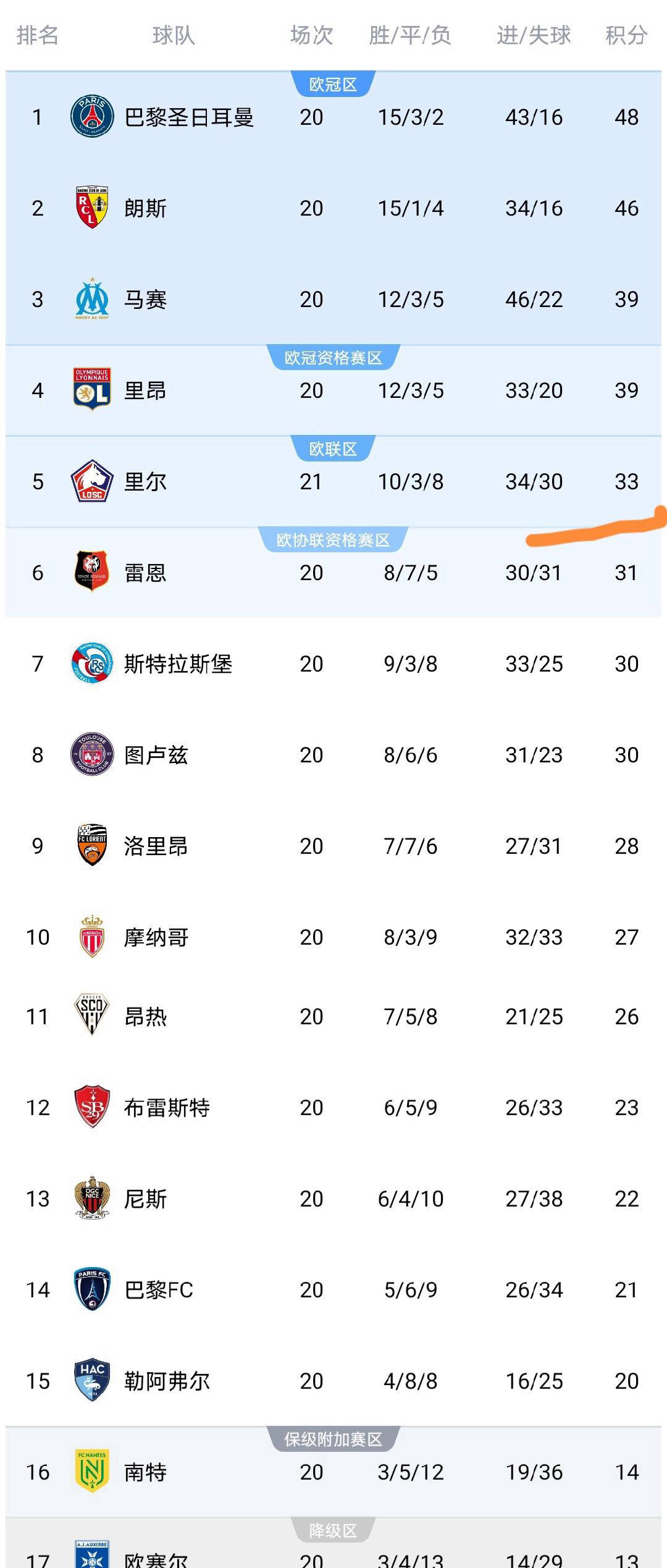 积分榜形势也因此发生变化:里尔积33分,依然排名第五,但与第四名已经拉开了6分差距,保住欧战资格的压力骤增;而梅斯则凭借这宝贵的一分升至13分,距离第16名的保级附加赛区仅差一分,仍然具备争取留在顶级联赛的希望。值得一提的是,目前法甲射手榜上只有格林伍德和帕尼切利两人进球超过两位数,他们继续领跑本赛季的得分榜。