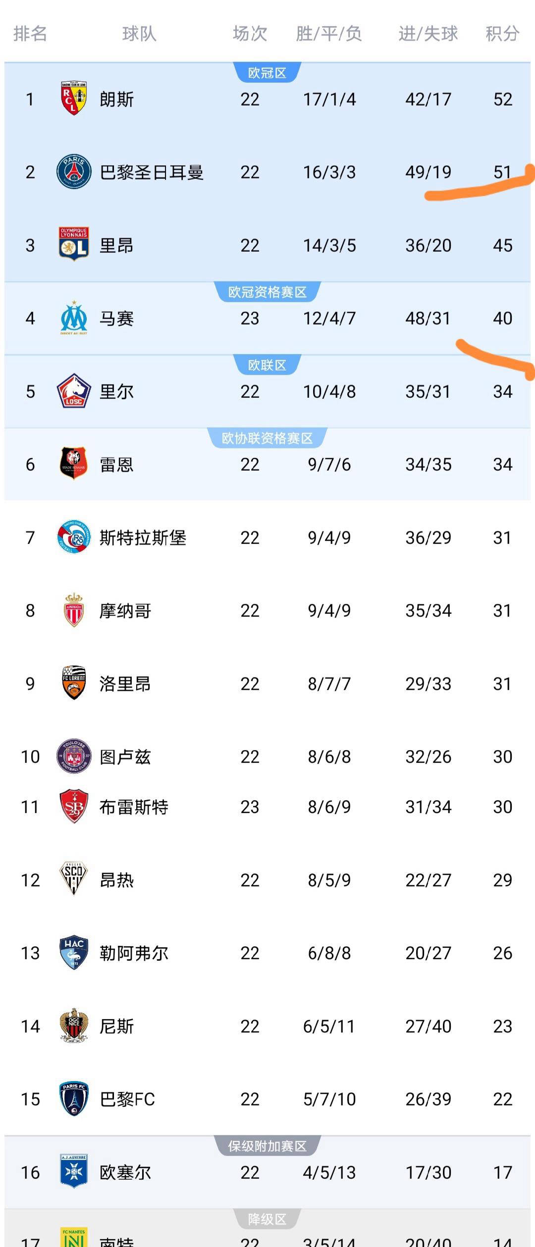 目前积分榜上,朗斯队保持领头羊位置,巴黎圣日耳曼稍落后1分位居次席,里昂尽管落后7分,但仍具备争冠潜力。整体看来,本赛季的法甲联赛竞争异常激烈,多支球队均有机会争夺冠军或欧战资格。